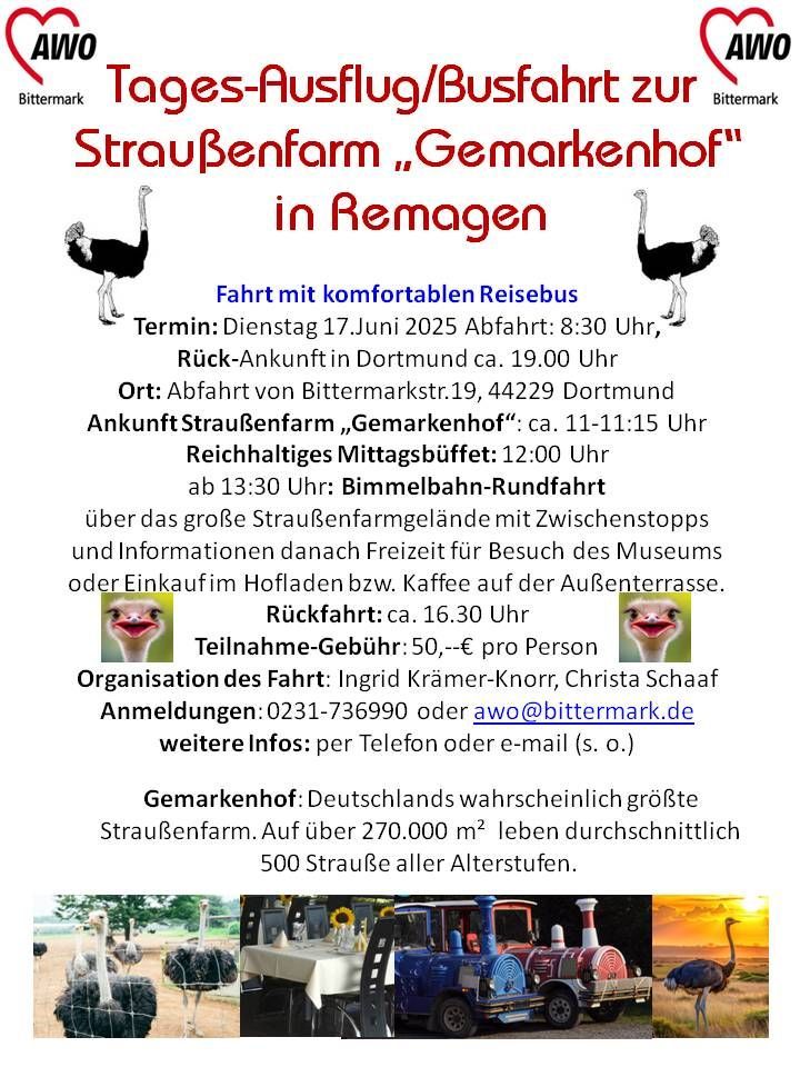 Ein schöner Tag in der Eifel zu Besuch bei bemerkenswerten Vögeln Der AWO-OV Bittermark hatte zum 17.06.25 zu einer geselligen Busfahrt in die Eifel mit dem Ziel Straußenfarm „Gemarkenhof“ bei Remagen eingeladen. Rund 25 Personen aus der Bittermark und Umgebung folgten dieser Einladung gern und wurden nach einer gemütlichen Busfahrt bei sehr schönem, sonnigen Wetter auf der Farmanlage mit dem reichhaltigen Essens-Angebot in Form eines Straußen-Buffet“ belohnt, welches neben den üblichen Buffet-Angeboten auch speziell eine Straußen-Suppe, Straußenschmalz und Straußenfleisch im Angebot hatte. Bei Besuch des Hofladens konnten dann auch spezifische Produkte dieser besonderen Vogelart wie Staubwedel, Modeaccessoires oder auch Leder-Produkte wie z. B. Taschen, Gürtel, Schuhe und Handschuhe erwerben. Danach ging es dann mit der „Bimmelbahn“, die vom Farmer Ralph Schumacher selber gesteuert wurde, im gemütlichen Tempo auf zu einer Rundfahrt über das weite Gelände der Farm (ca. 270.000 m²), wo insgesamt rund 500 Strauße jeden Alters leben. An mehreren Stationen verweilte die Bimmelbahn, so dass die Farm-Besucher aussteigen und den Straußenvögeln sehr nah sein konnten. Der Farmbetreiber Ralph Schumacher nutzte jeweils die Gelegenheit um auch auszusteigen, und den Besuchern mit Begeisterung viel Faktenwissen (wie z. B. ca. 35kg Fleischertrag je Straußenvogel) oder auch amüsantes über diese ziemlich spezielle Vogelart zu erzählen, wie z. B. dass jeder Straußenmann mit 2 Straußenfrauen lebt (eine Ehefrau und eine Geliebte), sie haben keine Zähne und keinen Magensaft, aber essen dafür immer Steine, die das aufgenommene Essen im Magen bei der Fortbewegung zerkleinern und dass die Strauße als Fluchttiere immer einem anderen Strauß hinterherlaufen, sobald sich einer in Bewegung gesetzt hat, wobei sie Geschwindigkeiten von bis zu 70 Km/h erreichen können. Die Strauße sind die größten lebenden Vögel der Welt, die Männchen erreichen bis zu 2,8 m Höhe und wiegen bis zu 160 kg und sind dadurch flugunfähig. Sie leben in Gruppen mit klarer Hierarchie und kommunizieren über Laute und Körperhaltungen. Ihre Eier sind die größten im Tierreich und sind bis zu 2,3 kg schwer und so stabil, dass ein Mensch darauf stehen kann. Der Straußenmann (dunkles Federkleid) betreibt mit seinen 2 Frauen eine Gemeinschaftsbrut, seine Weibchen (graues Federkleid) legen Eier in ein gemeinsames Nest, das von dem dominanten Männchen bewacht und bebrütet wird. Aber nur die Eier des als Ehefrau fungierenden Weibchens bringen wirklich Nachwuchs hervor. Auf der Straußenfarm werden Brutautomaten für die Eier eingesetzt, wo der SelektIons-Effekt nicht auftreten kann. Die Straußenvögel haben Anpassungen an trockene Regionen entwickelt und kommen mit wenig Wasser aus, da sie die benötigte Flüssigkeit über die Nahrung aufnehmen. Sie waren Ursprünglich in Afrika verbreitet, heute aber auch auf Farmen weltweit. Der Mythos, dass sie stecken den Kopf gerne in den Sand stecken ist heute entlarvt, da die Wissenschaft festgestellt hat, dass sie sich in Gefahrensituationen nur flach hinlegen, um sich zu tarnen. Mit einem Besuch der Brutstation und den wieder sehr interessanten Erläuterungen des Straußenfarmers und einer gemeinsamen Kaffee-Runde neigte sich der informationsreiche Besuch der Straußenfarm dem Ende zu, aber nicht ohne, dass interessierte Personen noch das Straußen-Museum besuchen konnten und ein Gruppenfoto gemacht wurde. Organisation der Fahrt: Ingrid Krämer-Knorr und Christa Schaaf; www.awo-bittermark.com Sichelstraße 7, 44229 Dortmund. Gemarkenhof: Deutschlands wahrscheinlich größte Straußenfarm. Auf über 270.000 m² leben durchschnittlich 500 Strauße aller Alterstufen.